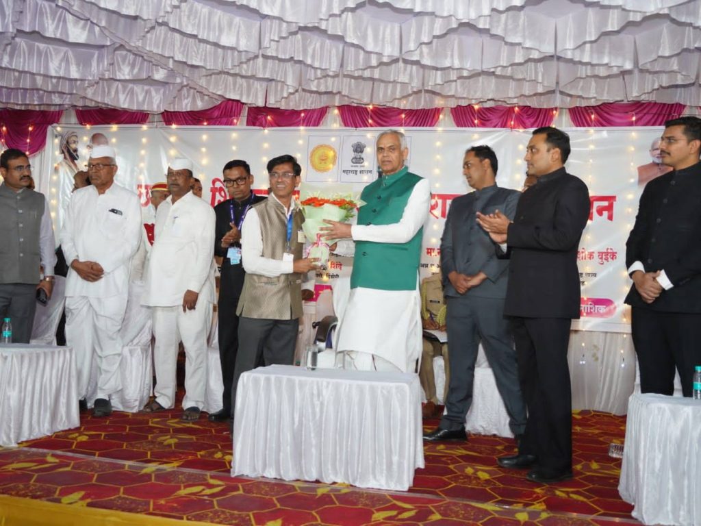 01.01.2026: Maharashtra and Gujarat Governor Acharya Devvrat attended the programme organised under the Chhatrapati Shivaji Maharaj Mahaswa Abhiyan at Pimparkhed in Dindori taluka of Nashik district. On this occasion, a total of 23 stalls of various departments were set up at the venue. The Governor distributed certificates and benefits on a representative basis. Beneficiaries were provided with the benefits of various multi-departmental schemes, including housing (Gharkul) and disability certificates. The Governor also felicitated Navnath Gangurde and his parents for his selection in the Border Security Force (BSF). Dattatraya Wani was honoured for receiving the State-level Krantijyoti Savitribai Phule Ideal Teacher Award. On this occasion, the parents of martyred soldiers from Dindori taluka were also honoured. The Governor was felicitated by tribal organizations and, on behalf of the villagers of Pimparkhed, by the Sarpanch and Upa Sarpanch.